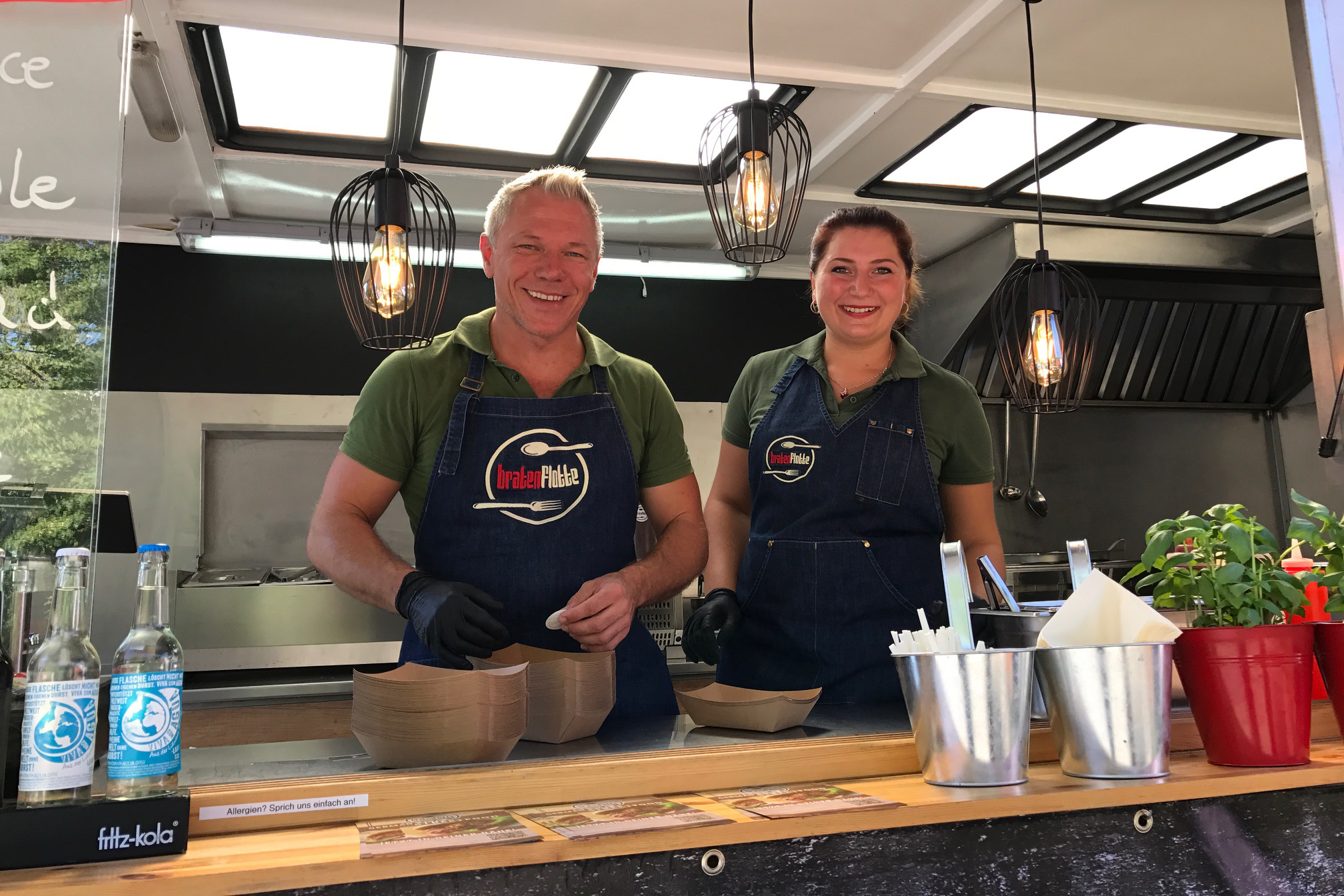 „Die Bratenflotte war auf unserem Weihnachtsmarkt mit ihrem FoodTruck. Die Schlange war ewig lang, aber das Team ist super eingespielt. 4 Leute auf 4qm und jeder Handgriff sitzt, die Aufgaben sind klar verteilt. So ging es super schnell – wie FastFood eben sein muss. Und super geschmeckt hat mein PulledPork-Burger auch noch!“